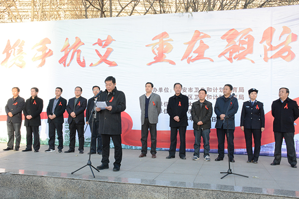 本网讯 12月1日下午,由延安市卫计局、宝塔区卫计局主办,我校承办,延安市公安局协办的“红丝带进校园”大型防艾宣传活动在窑洞广场举行。这次活动的主题是“携手抗艾,重在预防”,活动旨在加深青年大学生对艾滋病的认识并积极参与到抗击艾滋病的行列中来。我校副校长陈华,延安市卫计局局长郝建东,宝塔区政府副区长雷世全,我校后勤管理处副处长张志宇以及延安市、宝塔区相关人员与学生代表1500余人参加了活动。活动由延安市卫计局副局长胡骏主持。