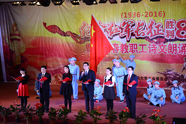 本网讯 12月29日晚,校工会在我校“5·23”音乐厅举行了纪念中国工农红军长征胜利80周年暨迎新春教职工诗文朗诵大赛,校党委副书记田伏虎、纪委书记王顺、总会计师范育琳,以及部分单位和学院的负责人及400余名教职工观看了比赛。