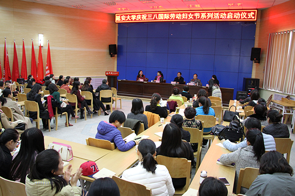 3月6日下午,庆祝“三八”国际劳动妇女节系列活动启动仪式曁读书交流会在我校路遥报告厅举行。校纪委书记王顺,校工会主席白泽生,附属医院副院长、延安市妇联副主席李红梅,校女工委副主任、人事处副处长刘小淼,校工会副主席成铭,以及全校女工委员、各基层分会女教师代表等参加了启动仪式。王顺书记在讲话中向全校女教职工致以节日的问候,希望女教职工们以这次活动为契机,深刻学习并领会习近平总书记在全国思想政治工作会议上的讲话精神,牢固树立立德树人的教书育人思想,多读书,读好书,共同推进学校各项事业的发展。