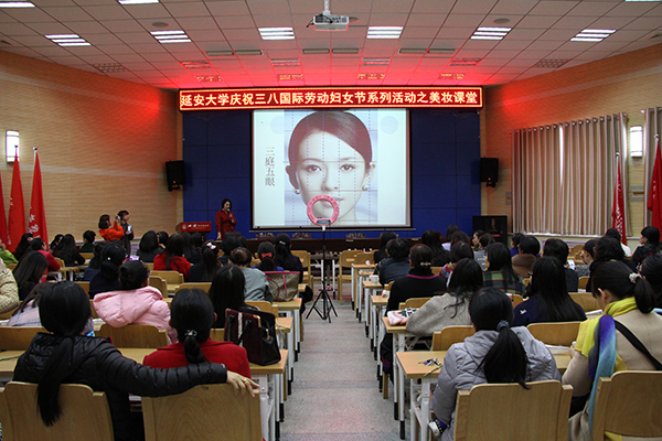 3月7日下午,为了提升我校女教职工的良好形象,将美的能量传播给更多的人,庆祝“三八”国际劳动妇女节系列活动之“世界因你而美丽”美妆讲座在路遥报告厅举行。讲座由我校工会副主席成铭主持,我校约200名女教职工聆听了讲座。雅丽美妆学院院长秦雅丽女士就如何选择合适教师的职业淡妆、如何配合着装选择合适的彩妆色系等问题,通过实际操作进行了详细讲解。秦女士一边讲解一边示范,课堂上流淌着温婉的气息,飘荡着柔和的香味,给人一种美的享受。
