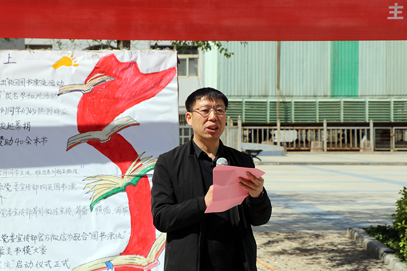 图书馆馆长徐长玉在启动仪式上致了辞。他希望大家通过多种形式和渠道加大宣传,重塑阅读理念,共同推动书香校园建设;希望广大师生积极踊跃捐献图书,不断充实丰富图书资源;希望广大读者在阅读图书时爱护图书,诚信阅读,增加图书的利用价值。同时他代表主办方向同学们发出倡议:“希望经典名著在校园里漂起来,建立情感纽带,构筑共同记忆,搭起幸福阶梯;希望经典名著在校园里漂起来,坚守道德底线,夯实诚信基石,塑造君子之德;希望经典名著在校园里漂起来,承袭中国文化、引领先进文化、守望正义良知。”