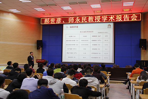 聘任仪式结束后,郝世彦教授作了《延长石油资源勘探开发进展与展望》的学术报告,介绍了延长石油集团的概况、资源勘探开发进展及前景展望。师永民教授作了《延长石油稳产与环保对策及人才学科建设发展方向》的学术报告,介绍鄂尔多斯盆地油气地质特征、开发规律及面临的问题,油气稳产面临的技术难题及对策,油区环保形势及解决途径。并根据当前行业形势对延安大学石油学院人才培养方向、学科建设发展方向给出相关建议。