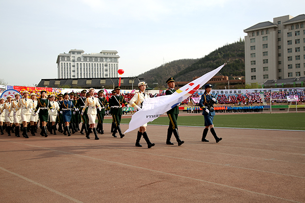 护旗队、校徽方阵、花束方阵、仪仗队方阵、裁判员方阵、各参赛单位运动员方阵等陆续通过主席台。随后,在雄壮的校歌声中,本届田径运动会会旗冉冉升起。