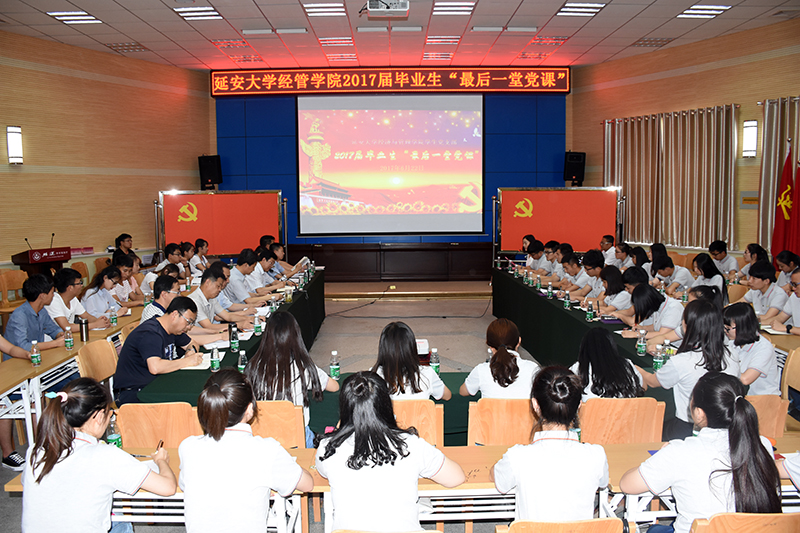 本网讯 “即将启程去另一片天地,这一课是母校给予我们毕业生党员的珍贵礼物,在此聆听真情嘱托,谆谆教诲,完成一名党员又一次的蜕变。”毕业生党员马颂浩如是说。6月22日下午,经管学院2017“毕业生最后一堂党课”主题党日活动在路遥报告厅举行。我校党委书记薛义忠参加活动并为毕业生党员讲了党课。校党委副书记田伏虎,党委委员、组织部部长姚正宽,党委委员、宣传部部长杜红荣,党委委员、学工部部长高峰,团委书记李杨,党委办公室、校长办公室副主任兰鸿涛,经管学院院长姬雄华、党委书记姜庆,以及40名毕业生党员和10名学生党员代表等参加了党日活动。党日活动由经管学院学生第三党支部书记王欢主持。