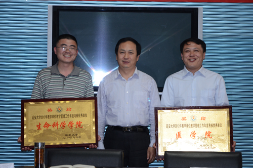 会上,教务处副处长雷伟宣读了关于2012年教学单位教学管理工作年度考核优秀单位的表彰决定,评估处处长王东维宣读了2012年毕业论文(设计)工作先进单位的表彰决定。胡俊生副校长为获得2012年教学管理考核优秀单位医学院、生命科学学院及获得2012年毕业论文(设计)工作先进单位的计算机学院、医学院、政法学院和财经学院颁发了奖牌。