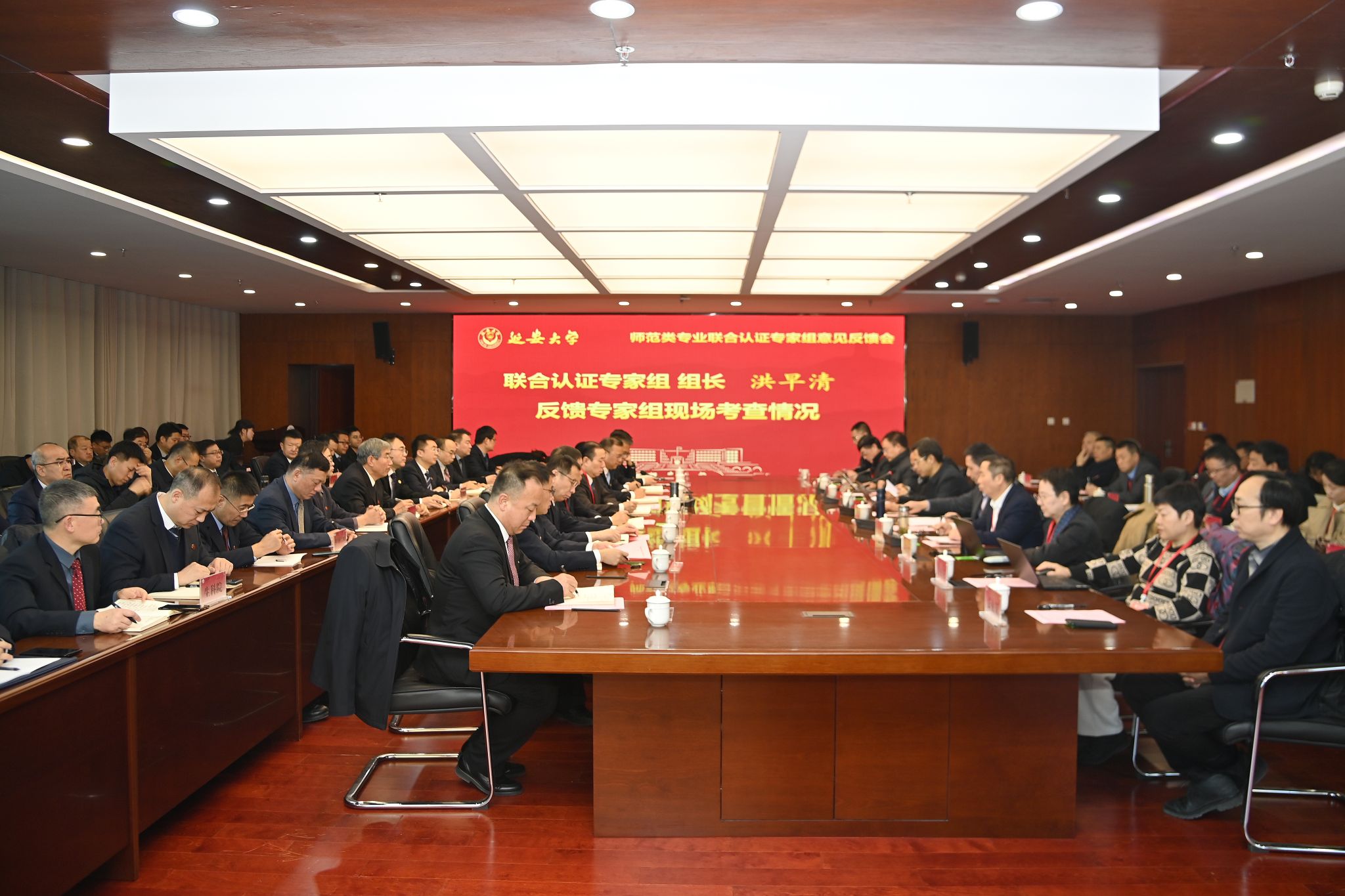 12月17日上午,学校召开专家组意见反馈会,洪早清主持会议并代表联合认证专家组反馈了现场考查意见。他指出,延安大学始终坚持用延安精神办学育人,秉持为基础教育服务的初心,把师范教育放在优先发展的重要地位。学校明确了构建特色鲜明、区域一流教师教育体系的顶层架构,并以师范教育为抓手,着力推进其他领域教师教育改革,师范专业建设取得良好成效,师范人才培养受到了用人单位广泛认可。同时,他就教育技术学专业人才培养需求调研、培养目标合理性评价、课程目标达成评价制度建设等方面提出了意见建议。各专业专家组长结合考查情况,从专业建设现状、存在问题与不足、改进建议等方面分别反馈了专业考查意见。