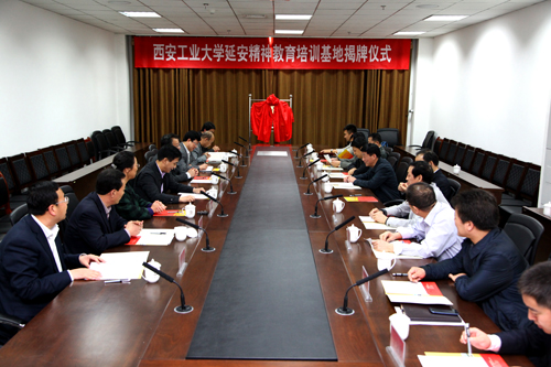 本网讯 4月24日下午,西安工业大学延安精神教育培训基地揭牌仪式在我校图书馆第一会议室举行,陕西省委第四巡视组组长曹克勤、正厅级巡视专员高春义,副组长田进进、副厅级巡视专员李小立,正处级巡视专员李劲旗、王旭坚等一行与我校党委副书记、校长崔智林,西安工业大学党委副书记、校长廉振民,我校党委副书记田伏虎,西安工业大学纪委书记许尚年,以及两校组织部、宣传部、党办、校办、监察处等部门的负责人共同参加了揭牌仪式。揭牌仪式由我校党委副书记王亚杰主持。