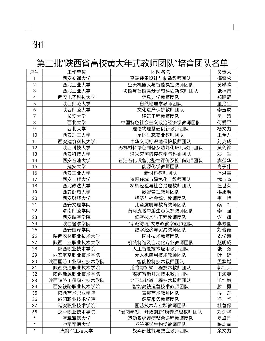 本网讯 近日,陕西省教育厅公布了第三批“陕西省高校黄大年式教师团队”培育团队名单,我校化学与化工学院高子伟教授领衔的“能源化学教师团队”成功入选。