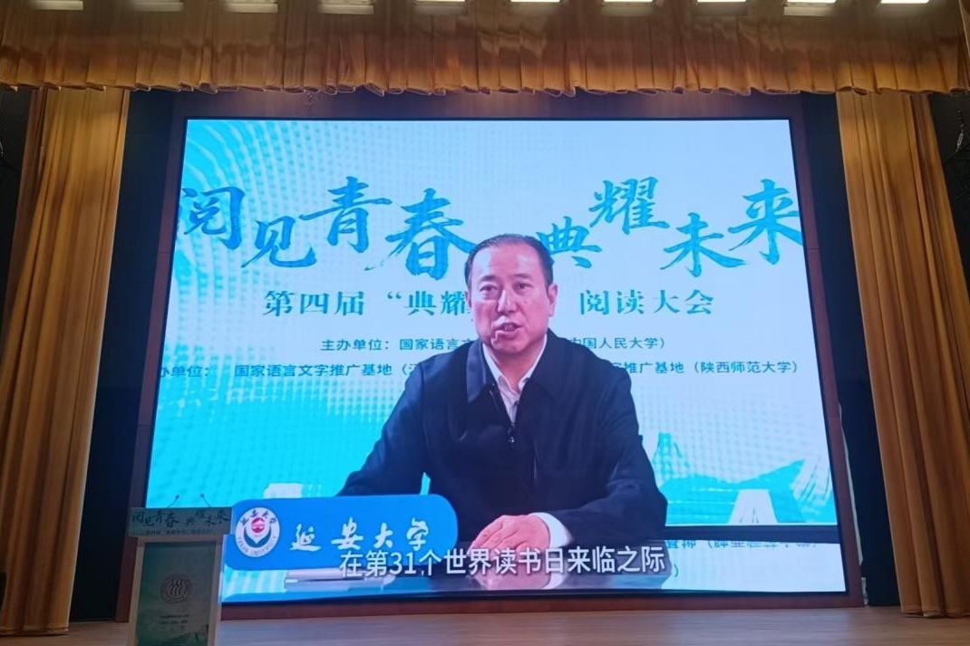 4月16日,主论坛在北京中国人民大学举行,我校党委书记高子伟以视频方式发表致辞,他指出,“典耀中华”阅读大会作为传承中华文脉、弘扬经典文化的实践高地,是深化全民阅读的生动载体,更是落实立德树人根本任务的重要抓手。延安大学作为中国共产党创办的第一所综合性大学,始终把传承和弘扬延安精神作为天然使命,将革命文化作为立德树人的重要内容,深入开展“读红色经典、唱红色歌曲、演红色剧目、写红色诗文、创红色版画”等经典阅读与艺术创演活动,持续打造“延河讲堂”等品牌;组织师生走进革命旧址开展研学,深刻体悟延安精神的时代价值,自觉传承党的光荣传统与优良作风。他希望,以本次大会为契机,创新阅读推广机制,深化阅读内容引导,让经典持续滋养青年心灵,为培养担当民族复兴大任的时代新人、加快建设文化强国贡献更大力量。
