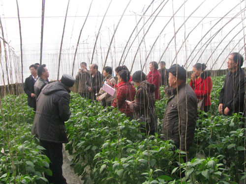 在温暖湿润的大棚里,在葱绿鲜活的蔬菜间,我校中文系89级毕业生,安塞县高桥镇党委书记张思臻介绍了大棚蔬菜产品、产量、产值、产销等情况。为了感谢母校的培养之恩,他表示,在延安大学为母校师生,建立一个减少从田间到餐桌的各种流通环节,降低蔬菜成本的,快速、低廉、新鲜的保本直销店面,让母校师生吃上最新鲜和真正的无公害蔬菜。吕达处长介绍了我校“农校对接”的情况。随后,老干部们参观了蔬菜生产基地,并与蔬菜种植户进行了沟通和交流。