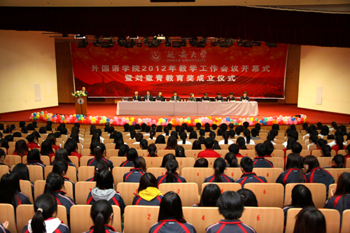 本网讯 10月22日下午,我校外国语学院在5·23音乐厅举行2012年教学工作会议开幕式暨刘意青教育奖成立仪式,党委副书记、校长崔智林,副校长许静洪,我校名誉教授、北京大学外国语学院博士生导师刘意青,教务处处长武忠远,研究生学院院长杨亮才,学工部部长、学生处处长韩卿元,就业指导服务中心主任马建平,团委书记姜庆,原我校外语系主任李志远,以及外国语学院全体教工和部分学生代表参加了会议。会议由我校外国语学院党委书记董振文主持。