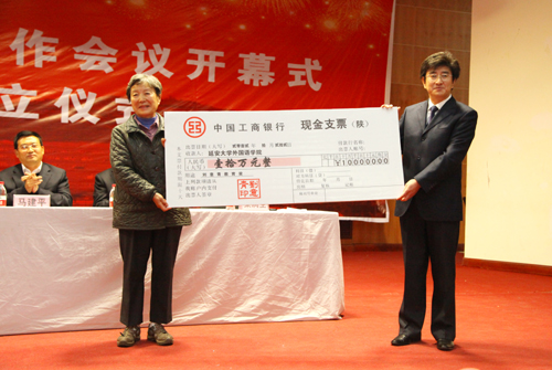 随后,举行了刘意青教育奖设立仪式。刘意青教授向梁润生院长转交了捐赠牌,将自己10万元的积蓄作为奖学金,资助和鼓励在学习、工作中做出突出成绩的延安大学外国语学院师生。刘意青教授在讲话中深情谈到了自己与延安大学的不解之缘,希望同学们好好学习,掌握好学科专业知识,培育自己的人文学养。