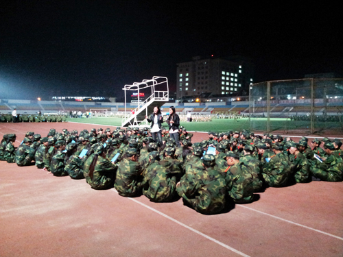 ▲9月17日晚,学员们在操场上席地而坐,练习比赛歌曲。 冯成博/摄