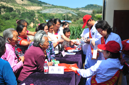捐赠仪式结束后,青年志愿者们在石头沟村党员活动室门前举行了义诊活动。由外科、内科、儿科、药剂经销科等科室的相关医护人员组成的青年志愿者医疗服务队,为石头沟村的群众进行了义诊,为村民们提供了血压测量、医疗咨询、康复指导、药品正确使用及医疗保健知识宣传等。共为当地群众测量血压30余人,义诊60余人,发放药品价值700余元人民币、宣传资料200余份。