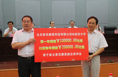 北京索克赛思科技有限公司还在我校设立了励志奖学金,奖金2012年为10万元,以后每年为20万元,用于奖励40名获奖学生,其中特等奖20名,优秀奖20名。捐赠仪式上,获得2012年励志奖学金的40名学生分为三批,先后上台领了奖,胡俊生副校长和黄海董事长为获奖学生颁了奖。