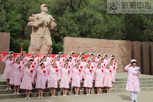 本网讯 为了庆祝5·12国际护士节,5月12日上午,医学院护理系全体师生来到延安枣园张思德烈士纪念碑前,追寻昔日英雄足迹,重温为人民服务的精神,并为即将走上实习岗位的2008级学生举行了授帽仪式。医学院护理系主任贺清明主持了授帽仪式。