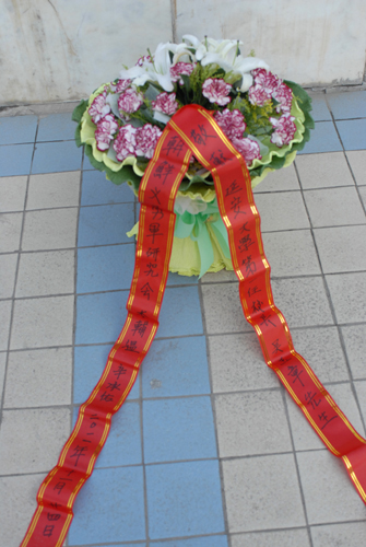 本网讯 今天上午,韩国朝鲜义勇军研究会干事李辅温和吉林朝鲜文报社主任摄影记者辛承佑来到我校逸夫楼广场前,拜谒了首任校长吴玉章的铜像并敬献了花篮。花篮的飘带上写着:“敬献延安大学第一任校长吴玉章先生。朝鲜义勇军研究会李辅温、辛承佑,二〇一一年十一月二十四日。”