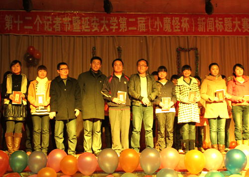 在节目表演间隙,出席晚会的老师们为我校第二届新闻标题大赛获奖选手先后颁了奖。这次大赛分为专业组和非专业组,每组都分设了消息类和通讯类两类奖项。晚会在财经学院会计二班闫洁演唱的歌曲《完美》中结束。