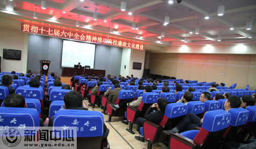 本网讯11月10日下午,省委教育纪工委副书记王世森,在我校图书馆学术报告厅作了题为《贯彻党的十七届六中全会精神,推动高校廉政文化建设》的报告。我校各部门处级以上领导干部,后勤处、基建处、房产处、财务处、萃园校区建设指挥部等部门科级以上干部参加了报告会。报告会由校党委书记刘建德同志主持。