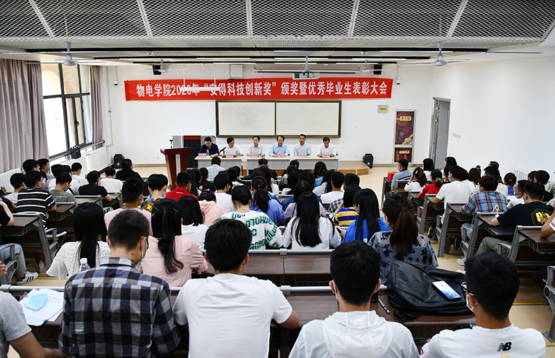 本网讯 6月4日下午,物电学院在新校区2号教学楼第一阶梯教室举行了2020年“安得科技创新奖”颁奖大会。学工部副部长乔剑、学院领导班子全体成员、获奖教师、学生及全体在校学生100余人参加了大会。大会由张富春副院长主持。