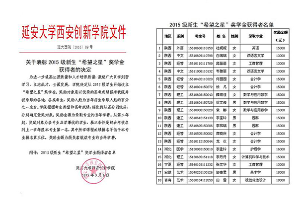 “希望之星”奖学金首次奖励对象是被西安创新学院录取且高考成绩优秀的全国各地考生,奖励人数为当年招生人数的1%。学院根据考生类型和高考成绩,按比例从高到低,确定了18名受奖对象。奖励金额为录取专业的当年学费。从第二年起,奖励对象为学院每个专业品学兼优的学生,基本条件是综合考核名列上一学年度本专业第一名,其中所学课程成绩排名不低于本专业排名第三位,奖励金额为本人就读专业的当年学费。