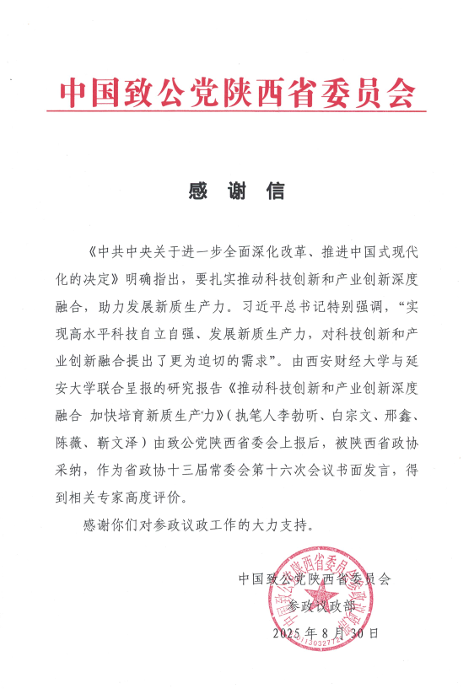 此次研究成果的采纳,是高校统一战线成员积极参政议政、建言献策的重要体现。中国致公党陕西省委员会专门致信感谢,指出《中共中央关于进一步全面深化改革、推进中国式现代化的决定》明确提出要“扎实推动科技创新和产业创新深度融合”,而本报告紧扣国家战略部署,聚焦发展新质生产力的关键路径,具有较强的理论价值与实践指导意义。