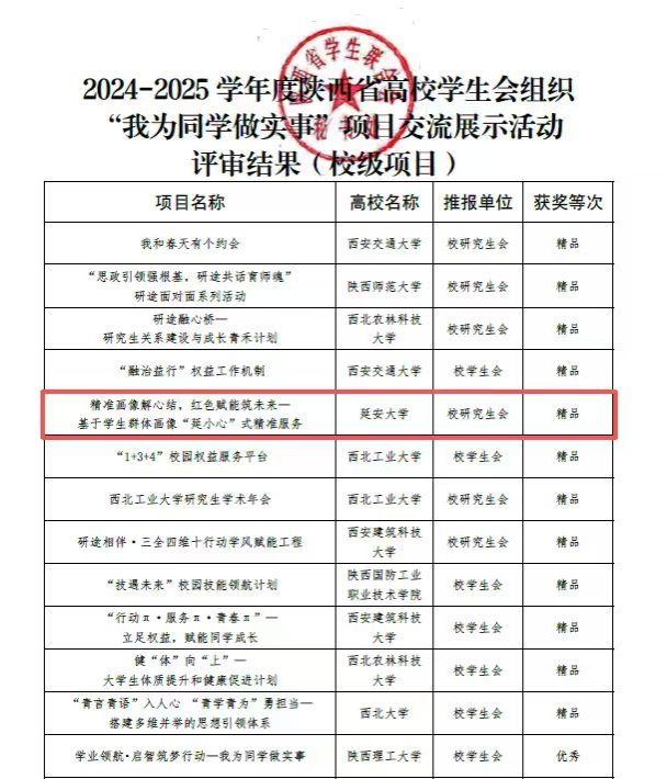本网讯 近日,由共青团陕西省委、陕西省学生联合会联合举办的2024-2025学年度陕西省高校学生会组织“我为同学做实事”项目交流展示活动评审结果正式揭晓。其中,我校团委推报的《精准画像解心结,红色赋能筑未来——基于学生群体画像“延小心”式精准服务》心理健康护航项目,在全省47所高校报送的110个参评项目中脱颖而出,成功获评“精品项目”等次,充分彰显了我校学生组织聚焦同学核心需求、创新服务载体模式的扎实工作成效,为全省高校学生服务工作提供了“延大经验”。