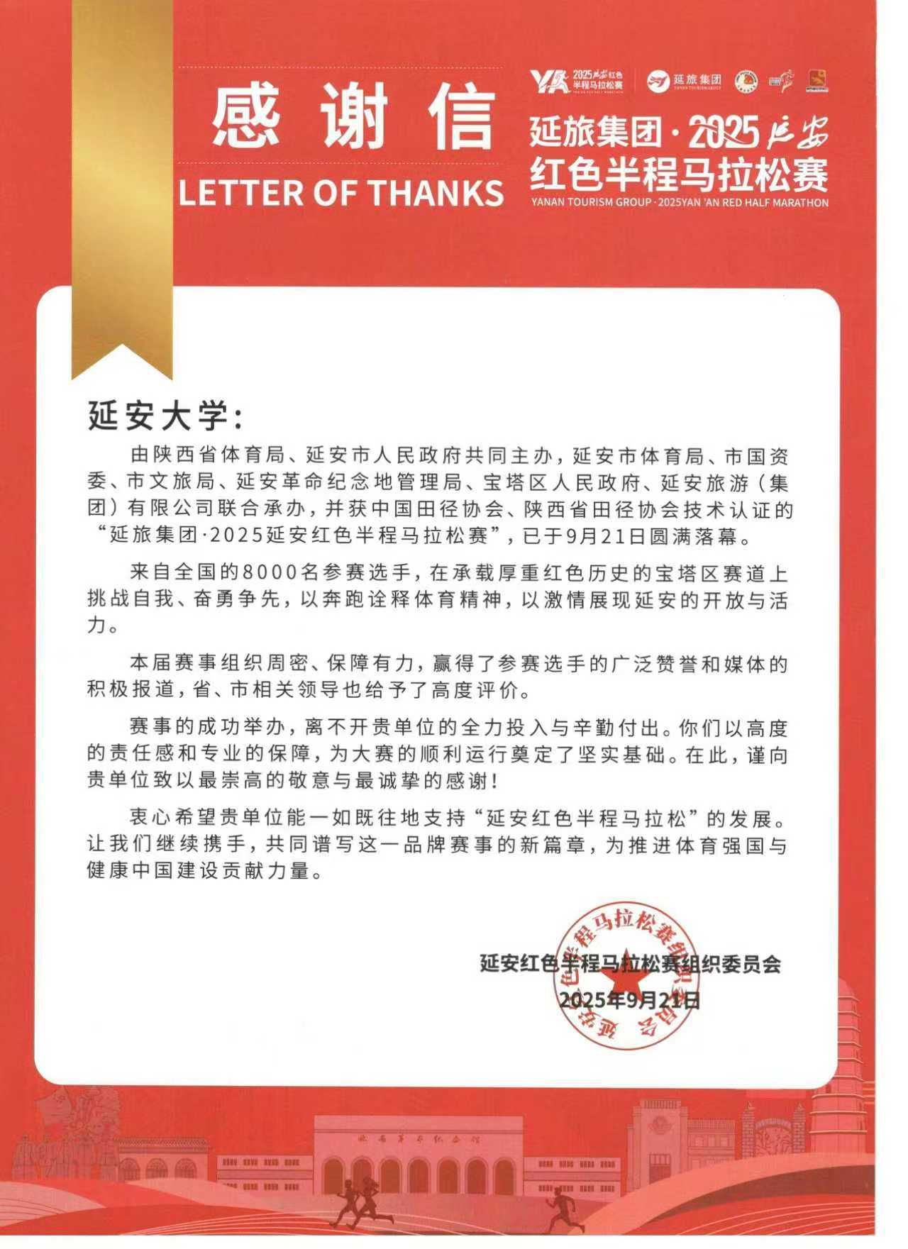 本网讯 9月21日上午,2025延安红色半程马拉松赛在延安市宝塔区正式鸣枪开跑。为助力赛事顺利开展,我校以张思德青年志愿者协会为载体,组建志愿服务团队,选派526名志愿者及5位带队教师全程参与保障工作。全体人员以高度的责任感、饱满的热情与专业的服务能力,坚守岗位、履职尽责,为赛事有序推进提供坚实支撑。