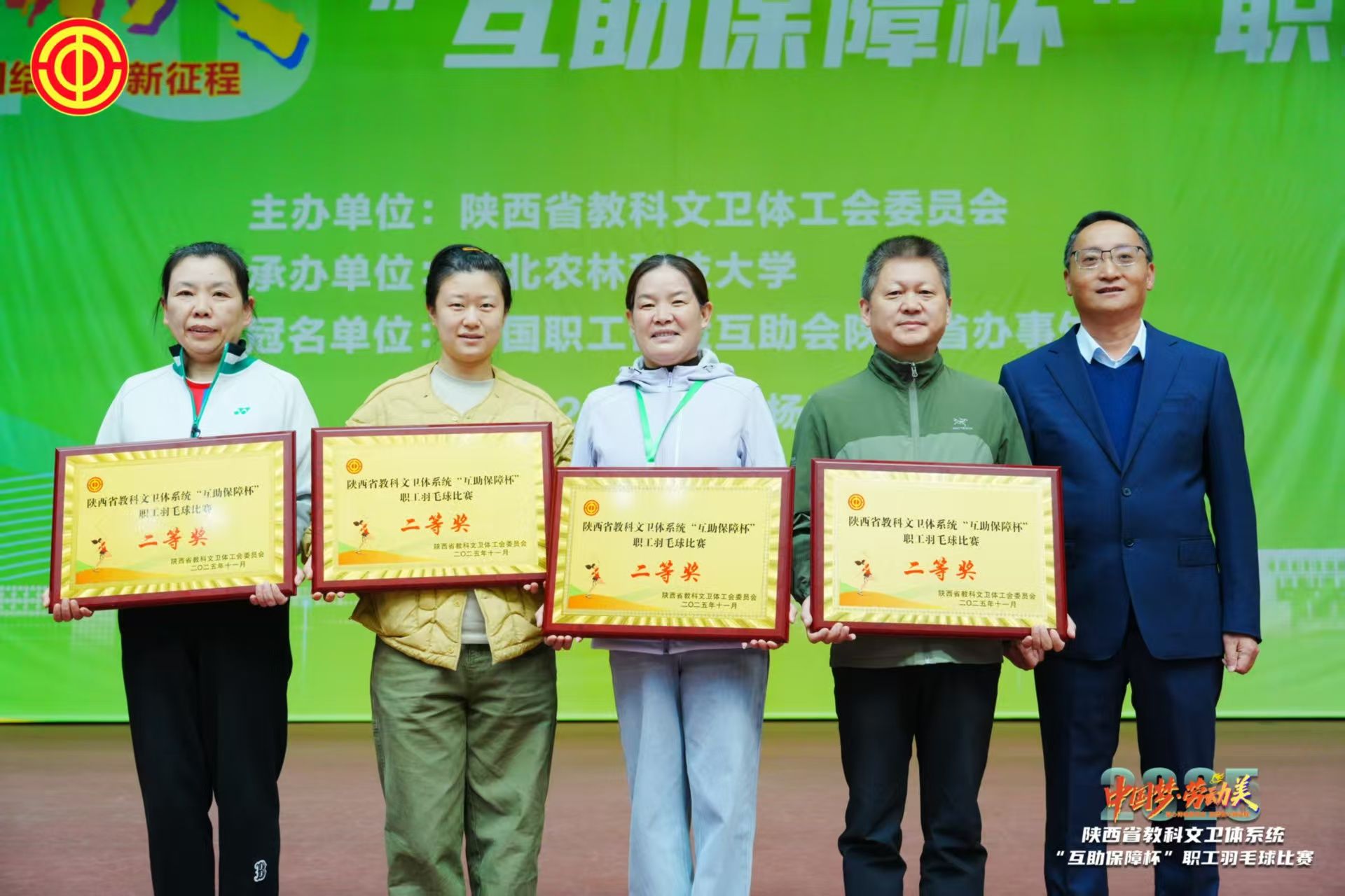 本网讯 10月31日至11月2日,“中国梦·劳动美——凝心铸魂跟党走 团结奋斗新征程”2025年陕西省教科文卫体系统“互助保障杯”职工羽毛球比赛在西北农林科技大学体育馆举办。来自全省57个单位的领队、教练员、运动员及裁判员共计800余人参赛。由我校工会组织、教职工羽毛球协会选派组成的教职工羽毛球代表队,经过激烈角逐,最终跻身八强,荣获二等奖。