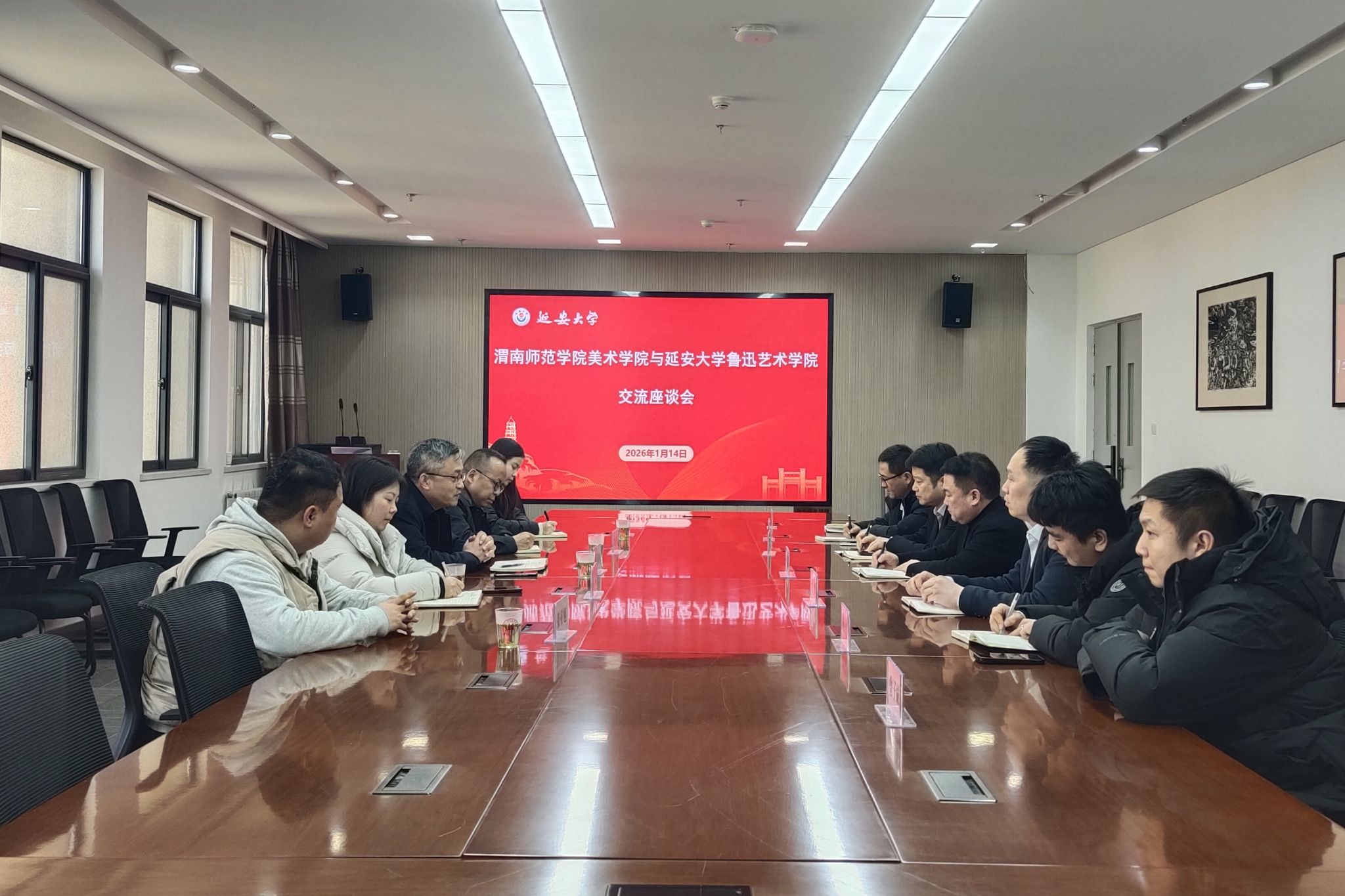 石海彬表示,延安大学鲁艺学院在学科建设、科研项目管理等方面积累了丰富经验,希望通过此次交流,重点围绕高水平科研项目申报、研究生培养机制优化、本科教学改革等议题学习宝贵经验,助力渭南师范学院美术学院教育教学快速发展。