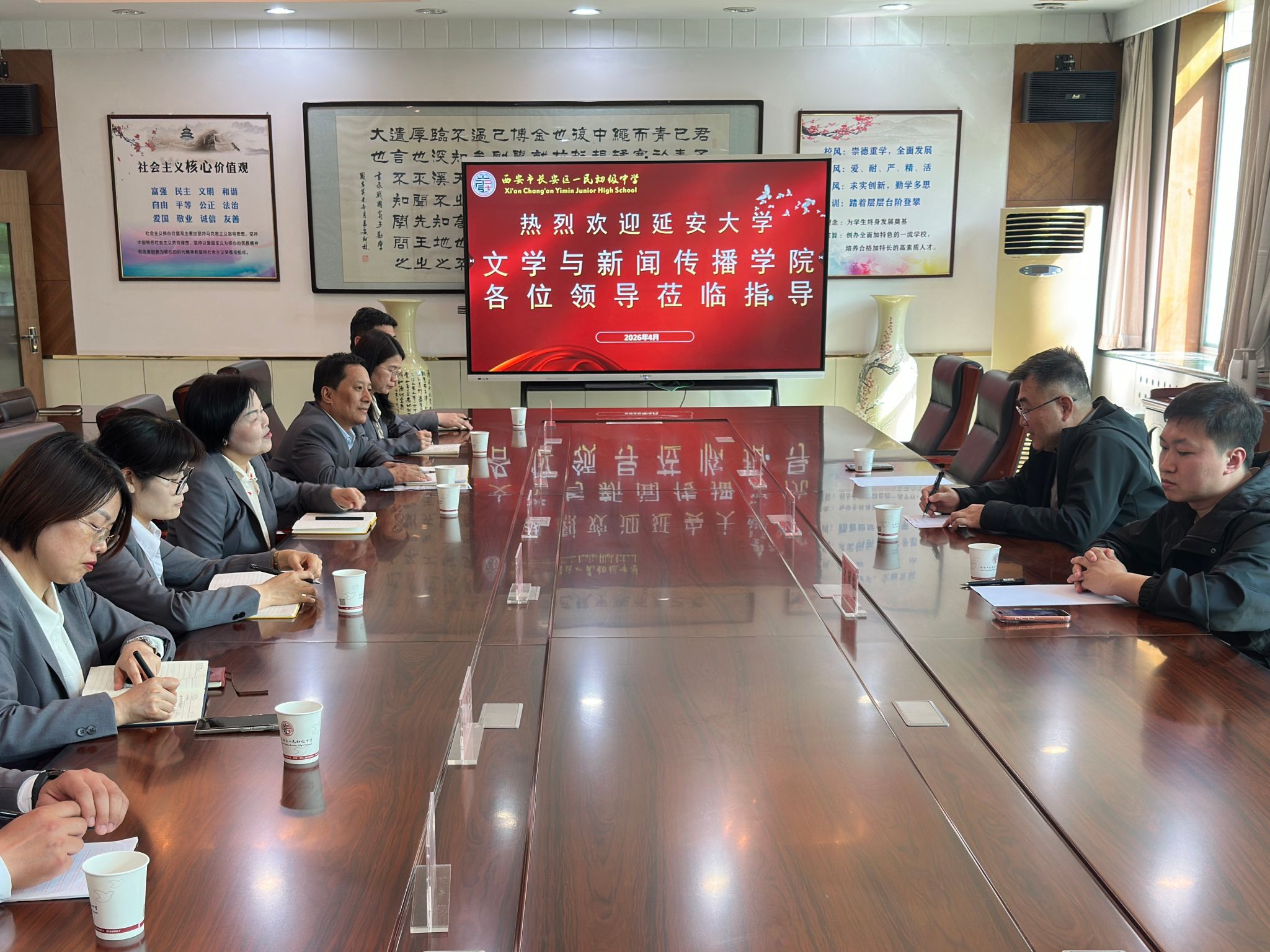 在西安市长安区一民初级中学,该校党支部书记、校长吴美娜,党支部副书记薛飞等校领导出席座谈会。薛飞详细介绍了学校的办学理念、师资队伍建设及教学成果。党子奇介绍了学院汉语言文学国家级一流专业建设成效及卓越中学语文教师培养项目。双方就教师人才培养、实习就业合作等达成共识。在该校任教的我校部分毕业生参加了座谈交流。