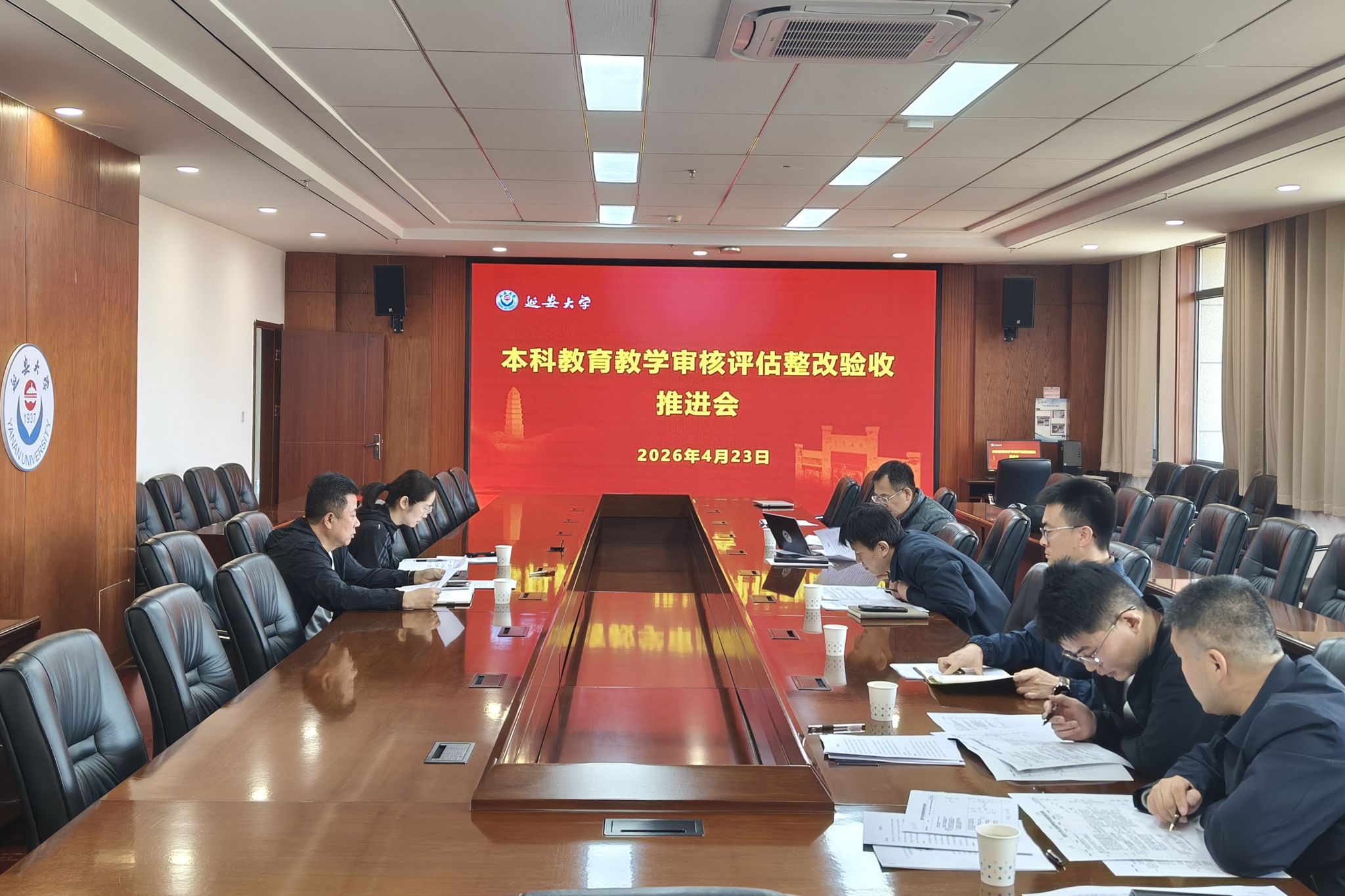 本网讯 4月23日上午,我校在行政楼七楼会议室召开本科教育教学审核评估持续整改推进会。党校办、教务处、规划处、科技处、学生处、评估处等牵头部门负责人参会,会议由评估处处长王文东主持。