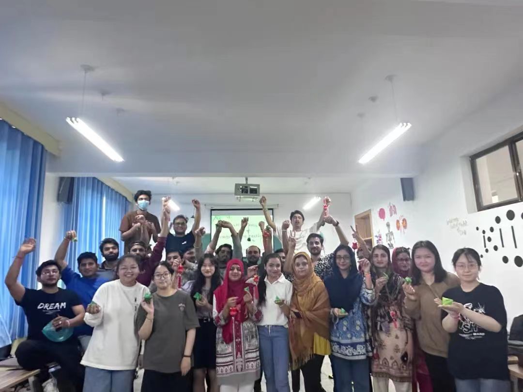 活动中,来自汉教20班的六位助教通过展示丰富多彩的图片和视频等形式,向留学生介绍了中国端午节的由来及端午节的习俗,以一首唐代诗人文秀的《端午》带领同学们了解我国伟大的浪漫主义诗人屈原,以及中国人在端午节日吃粽子、赛龙舟等风俗的来源,大家通过诗歌诵读和赏析,品味字里行间中语言和文化相融合的魅力,感受中华文化千年传承的精神。在“风俗体验”环节,留学生们一边学着挂艾草、编彩绳、折“粽子”,一边认真了解端午传统。助教老师还组织了趣味游戏,将准备好的香囊等礼物送给了留学生们,使现场气氛更加活跃。最后,活动在助教与留学生们互祝“端午安康”中步入了尾声。