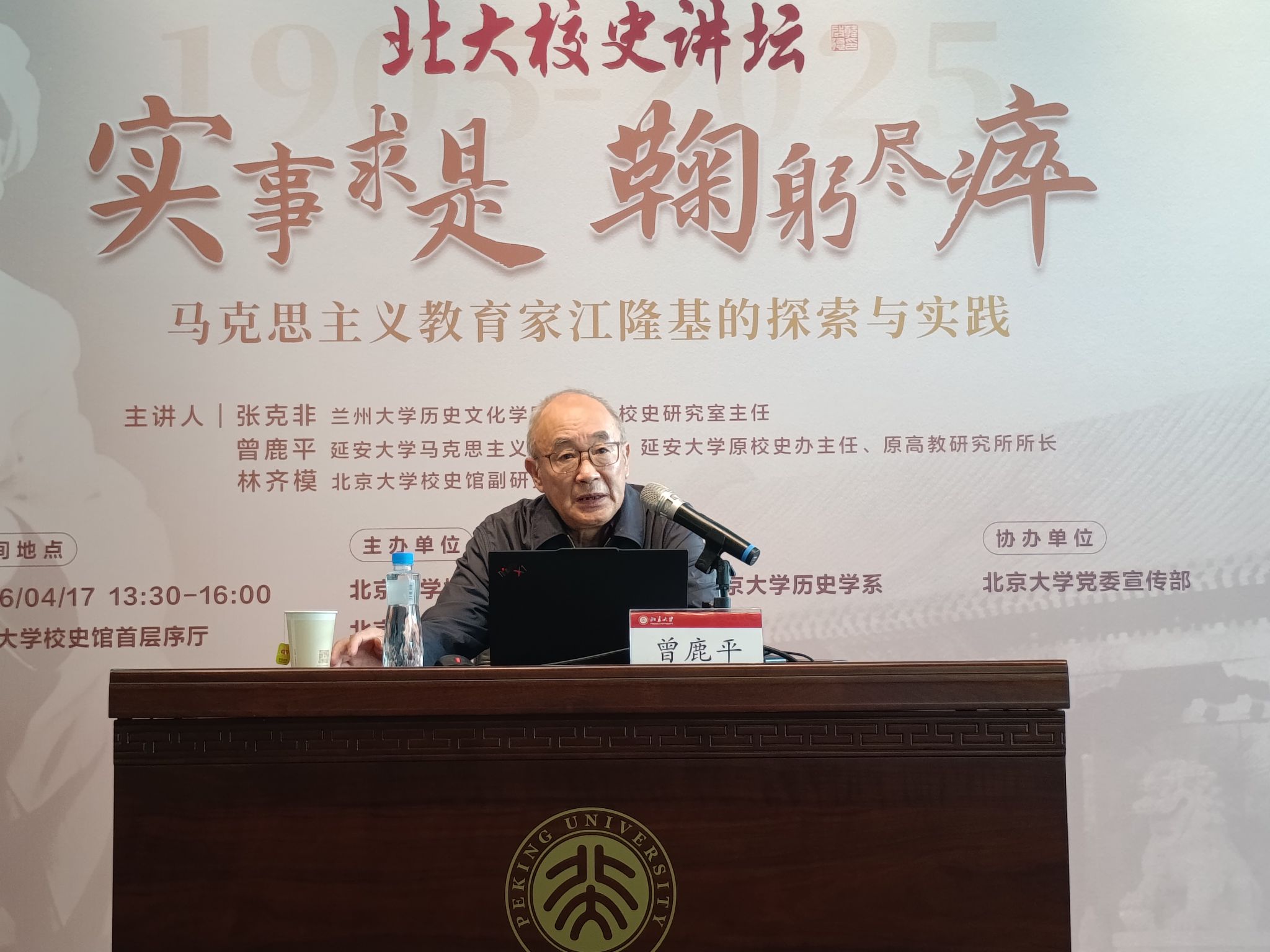 4月17日下午,以“实事求是,鞠躬尽瘁——马克思主义教育家江隆基的探索与实践”为主题的“北大校史讲坛”,在北京大学校史馆举行。我校马克思主义学院教授,原校史办主任、高教研究所所长曾鹿平应邀参加,并做了《江隆基的守正与创新——中共延安时期江隆基的教育实践与启示》的专题讲座。