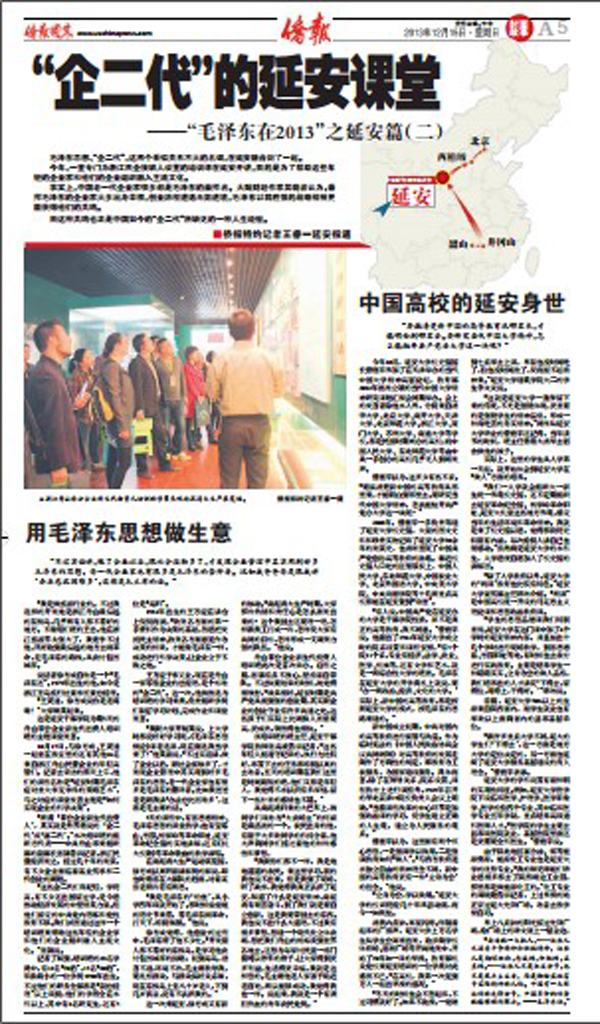 本网讯 大型综合性美国华文媒体《侨报》在2013年12月15日出版的报纸中,发表了由该报特约记者王睿一采写的新闻通讯《中国高校的延安“身世”》。该文以近三分之一的篇幅,介绍了延安大学在中国高等教育发展历史中的特殊地位,延安大学与新中国高等教育的渊源关系,延安大学所形成的独特的大学精神、办学理念和办学特色。这些精神、理念和特色突出的体现在了该校“立身为公,学以致用”的校训之中。