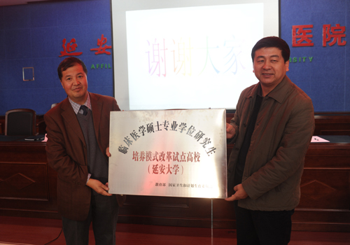 许静洪副校长对附属医院成为教育部、国家卫计委第一批“临床医学硕士专业学位研究生培养模式改革试点单位”表示热烈祝贺,对成为延安大学全科医学硕士临床培养基地、临床实践基地和社区实践基地的单位表示热烈的欢迎。他在讲话中指出:我校此次被列为第一批试点单位,将有利于推进我校临床医学硕士专业学位研究生培养与住院医师规范化培训结合,提高我校培养更多高层次应用型医疗卫生人才。同时,也将有利于延安医疗集团的建设和人才培养,更好地服务老区人民。