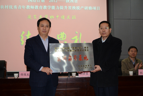本网讯12月15日上午,“国培计划(2012)”——陕西省农村优秀青年教师教育教学能力提升置换脱产项目延安大学初中语文班结业典礼暨陕西省首批“国培计划”项目和省级培训项目实训基地授牌仪式,在我校图书馆十楼学术报告厅举行。我校副校长胡俊生,实训实习基地学校领导,我校教师培训中心和教育科学学院有关领导,以及全体培训学员参加了典礼。典礼由教育科学学院党委副书记杨文军主持。