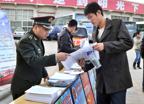 本网讯 为了响应国家号召,集中开展2012年冬季征兵入伍宣传动员工作,形成我校在校大学生生积极报名应征入伍的良好校园氛围,根据学校2012年征兵文件安排,10月30日,我校就业指导中心、武装部和延安市宝塔区武装部共同举办了2012年冬季征兵入伍现场咨询会,延安市宝塔区武装部副部长马永刚,我校就业指导中心副主任崔林立、武装部李志福等,在雅苑学生公寓前为在校大学生就入伍的相关政策和报名程序、要求等进行了解答,并发放了近4000份宣传材料。
