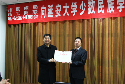本网讯 今天下午,延安市民宗局、市工商联和延安温州商会向我校少数民族学生发放资助金仪式在我校图书馆二楼会议室举行。我校党委副书记、纪委书记刘庆利,延安市政协副主席、民革延安市委主委张玉曙,延安市民族宗教局局长黄庆琳,延安市工商联主席胡正郁,延安温州商会会长陆生,延安市民族宗教局副局长张安平,以及我校学生处副处长、学生资助中心副主任雷志强,计算机学院党委书记李喜迎,马列学院党委书记郝琦,生命科学学院党委副书记薛皓,教科院党委副书记杨文军,与经我校统战部协调,市民宗局和市工商联联系的接受资助的21名少数民族学生和各学院学生代表参加了仪式。仪式由我校统战部部长、党办主任田伏虎主持。