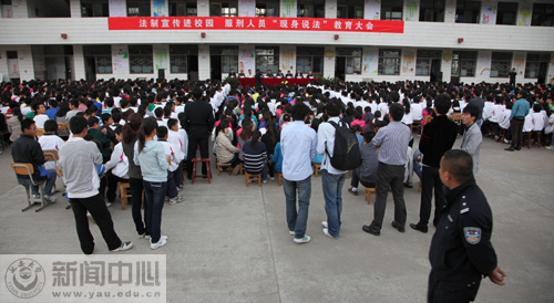 本网讯根据省委教育工委和省教育厅关于法制宣传进课堂的指示精神,在延安市综治办和宝塔区司法局的支持协调下, 9月24日下午,我校综治办特邀延安监狱,在附属中学举办了法制宣传进校园·在押服刑人员现身说法教育大会。大会由我校综治办主任张延涛同志主持。延安监狱党委副书记、政委周选民,延安监狱党委委员、副监狱长高玉开,延安市综治办综合科科长高玉才,宝塔区委依法治区办副主任、宝塔区司法局副局长马小权,宝塔区司法局法律服务管理科科长李旭,我校保卫处、学生处负责人,以及我校政法学院、化工学院部分学生和附中全体师生参加了大会。大会上,周选民副书记在讲话中剖析了青少年犯罪的家庭因素和社会因素,他希望通过这次法制宣传教育活动,使同学们能够认识到违法犯罪的严重危害性和接受法制教育的重要性,积极主动地学法、知法、懂法、守法。七名在押服刑人员现身说法,以自己的经历告诫大家要遵纪守法,并合唱了歌曲《争取宽大早回家》。最后,马小权副主任、高玉才科长和附中副校长李化才分别讲了话。