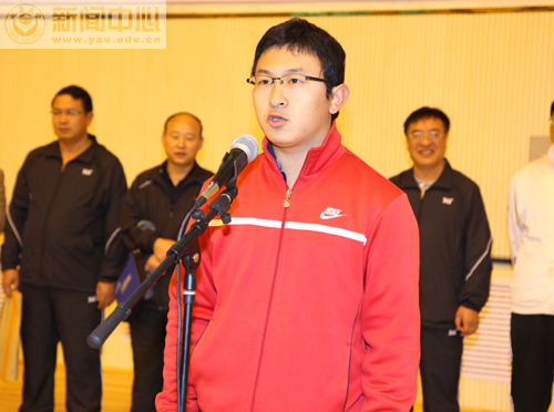 刘庆利副书记在开幕式上致了辞。他在致辞中希望通过这次比赛,能够促进学校教职工文体活动的开展与交流,进一步促进各部门之间的友谊和联系,增强教职工的集体主义观念和团队精神,不断提高我校教职工乒乓球比赛的竞技水平;希望各代表队能够严格遵守比赛纪律,服从比赛安排,尊重裁判,文明比赛;希望各位裁判员严格履行公开、公平、公正的原则,尽职尽责,秉公执法;希望各位运动员发扬“友谊第一,比赛第二”的良好体育道德风尚,努力拼搏,赛出友谊、赛出风格、赛出水平,努力把本次比赛办成增进友谊、增进团结、提高技艺、促进发展的赛事。随后,医学院分会刘延峰和体育学院学生韩畅分别作为运动员代表和裁判员代表宣了誓。