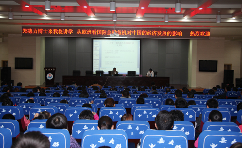 本网讯今天下午,中国银行法兰克福分行副总经理郑德力博士,在我校图书馆十楼报告厅作了题为《从欧洲看国际金融危机对中国经济发展的影响》的报告,我校师生近500人与中国银行延安分行领导及工作人员聆听了报告。报告会由我校副校长许静洪主持。