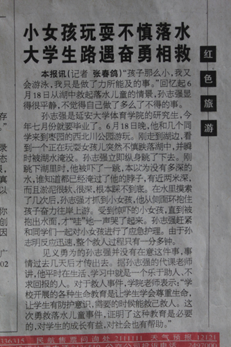 我校体育学院2008级研究生孙志强等同学在当天论文答辩结束后,也前往公园游玩。当他们在人工湖边留影时,旁边有几个小孩也在人工湖边玩耍。突然,其中一名12岁左右的小女孩脚下一滑,不慎滑入湖中。孙志强赶紧伸出手,试图将小孩拉起来,但小女孩在大呼救命的同时,扑腾了一下就沉入湖中。孙志强来不及多想,连衣服夜顾不上脱,就一下子跳入湖中。由于湖水太深,他一只手抓住岸边的石头,用一只胳膊从后面拦腰抱住小女孩,把她抱上了岸。孩子得救了,当人们从慌乱中回过神来时,发现孙志强已经默默离开了现场。抢救女孩时,孙志强的手机、钱包等都被水浸透了。事后,他十分淡然地说,自己只是做了应该做的事。