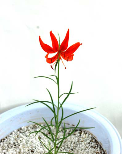 我校培育成功的这株山丹丹野生原种苗,于2008年采自延川县土岗乡小陈村。在自然条件下,由于病毒的浸染,往往导致山丹丹丛生、独叶和斑点等现象,影响其观赏价值。在陈宗礼教授的带领下,齐向英等研究人员采取热脱毒和化学脱毒相结合的方式,并通过酶联免疫反应检测,首次在实验室脱除百合丛簇病毒、百合无症病毒、黄瓜花叶病毒、郁金香碎花病毒、百合斑驳病毒、百合X病毒等9种病毒。脱毒后的植株花色更艳、花茎变大、叶片更细、株高变低。现在开放的山丹丹,花瓣平均长度5厘米,株高20厘米,叶片宽0.2厘米。