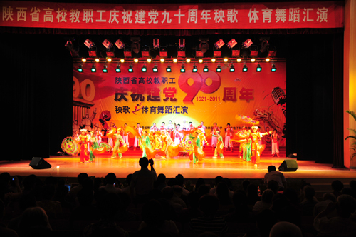 本网讯 为了庆祝中国共产党建党90周年,全面展示陕西高校教职员工奋发进取、昂扬向上的精神风貌,激发和凝聚广大教职工爱党爱国爱校热情,团结和号召广大教职员工坚定信念,振奋精神,鼓足干劲,投身党的教育事业,6月13日至14日,由陕西省教育厅和省教育工会举办的陕西省高校教职工庆祝建党90周年秧歌、体育舞蹈汇演在西安电子科技大学举行,全省各高校选送的44个节目参加了汇演比赛。我校工会选送的《陕北秧歌》作为比赛的压轴节目进行了表演,演员们动作矫健豪迈,情绪欢快奔放,赢得了观众阵阵热烈的掌声。经过激烈的角逐,我校教职工表演的《陕北秧歌》在44个节目获得了第一名,同时我校还以良好严谨的组织荣获“优秀组织奖”。