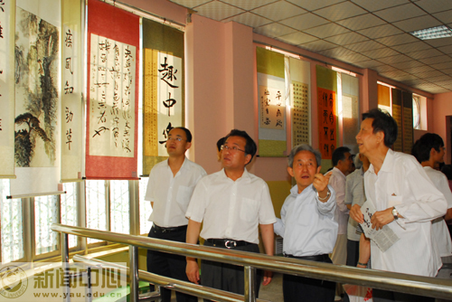 仪式结束后,崔校长与许副校长在党办和离退处等部门负责人的陪同下,观看了展览,并与在场的部分离退休教师进行了亲切交谈,询问了有关情况。参观完书画展后,崔校长、许副校长及部分老领导为书画展签名或题字留念。