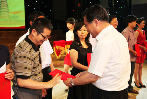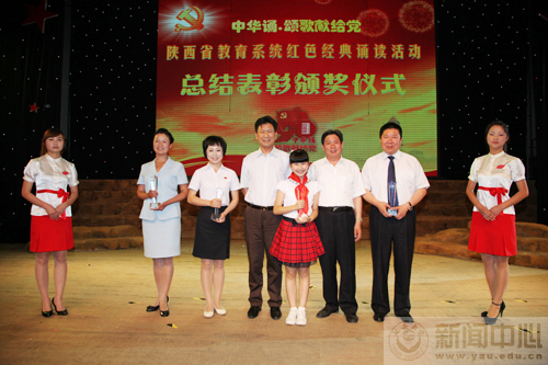 颁奖晚会上,吕明凯副厅长宣读了省教育厅、省语委办关于“中华诵•颂歌献给党” (延安篇)红色经典诵读大赛的表彰决定。王登峰司长和杨希文厅长为获得一等奖的延安慧泽小学、延安实验中学、西铁一中和延安大学等部分单位代表颁发了奖杯,并为获得最佳组织奖的西安市教育局、宝鸡市教育局、延安市教育局、延安大学、陕西艺术职业学院、陕西银行学校和陕西石油普教管理中心等部分单位颁发了奖牌,吕明凯副厅长和冯继红副市长为获得优秀组织奖的安康市、铜川市、咸阳市、商洛市、汉中市、榆林市、渭南市教育局和杨陵区教育文化体育局等部分单位颁发了奖牌,我校党委书记刘建德和校长崔智林为部分优秀指导教师颁发了荣誉证书。