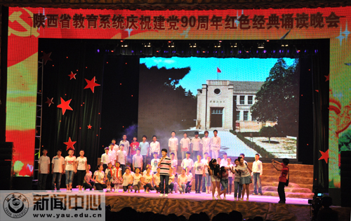 颁奖仪式结束后,“中华诵•颂歌献给党” (延安篇)红色经典诵读晚会正式开始。整台晚会以弘扬延安精神和庆祝建党90周年为主题,突出歌颂党的丰功伟绩、突出抗战历史、突出延安精神和陕西特色,充分体现了教育系统广大师生缅怀革命先辈、继承革命传统、弘扬延安精神、永远跟党走的坚定信念;展示了在党和国家的正确领导下,我省教育事业蓬勃发展、广大师生奋发向上的精神风貌。晚会节目形式多样,有独诵、双人朗诵、三人朗诵和集体朗诵等,表演形式丰富多彩,包括器乐伴奏、情景再现、歌舞表演等。
