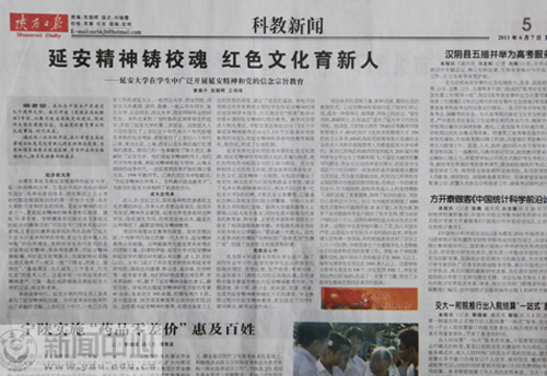 本网讯 6月7日,由我校党委宣传部副部长、校史办主任曾鹿平和陕西日报记者党朝晖、王鸣琦合写的工作通讯《延安精神铸校魂,红色文化育新人》,在《陕西日报》科教新闻版发表。