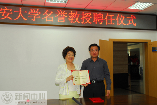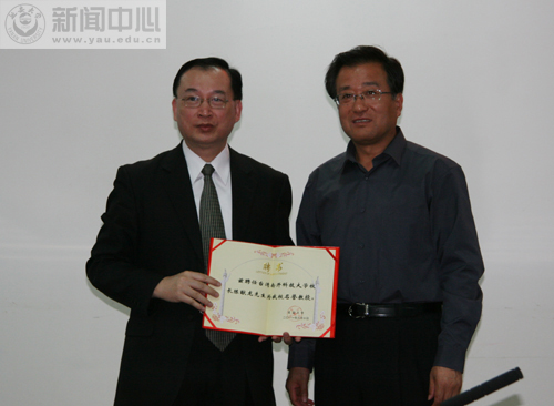 签字仪式结束后,举行了简短的名誉教授聘任仪式。胡俊生副校长宣读了聘任文件,崔智林校长分别向成嘉玲董事长和陈猷龙校长颁发了名誉教授聘书。